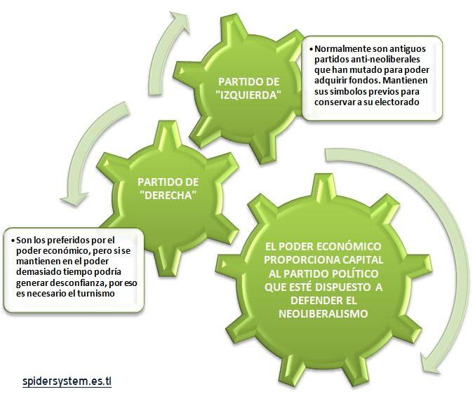 Para permitir que siempre se apliquen políticas neoliberales sin contestación social, el “poder oculto” financia a dos grupos políticos para que defiendan sus intereses, los Partidos Araña. Estos dos grupos una vez en el poder, aplican las mismas medidas neoliberales, pero se turnan y juegan a ser diferentes para dar sensación de pluralidad. Para hacer posible esto es necesario crear una “red de la desinformación” o NEMECONSYS.Cada uno de estos partidos recurre para sus estrategias a intelectuales de universidades o fundaciones afines y se difunde en la sociedad a través de sus propios grupos de comunicación. Las universidades y fundaciones de cada grupo diseñan equivalentes planes neoliberales, mientras que los medios de comunicación de cada grupo utilizan equivalentes temas para desviar la atención, mientras “juegan a las diferencias” entre los dos. Las seis patas en las que se apoya el Entramado Araña (intelectual, política y mediática de cada grupo) reciben financiación del “poder oculto” en la medida en que la necesiten, para abortar cualquier amago de éxito de las otras opciones políticas..